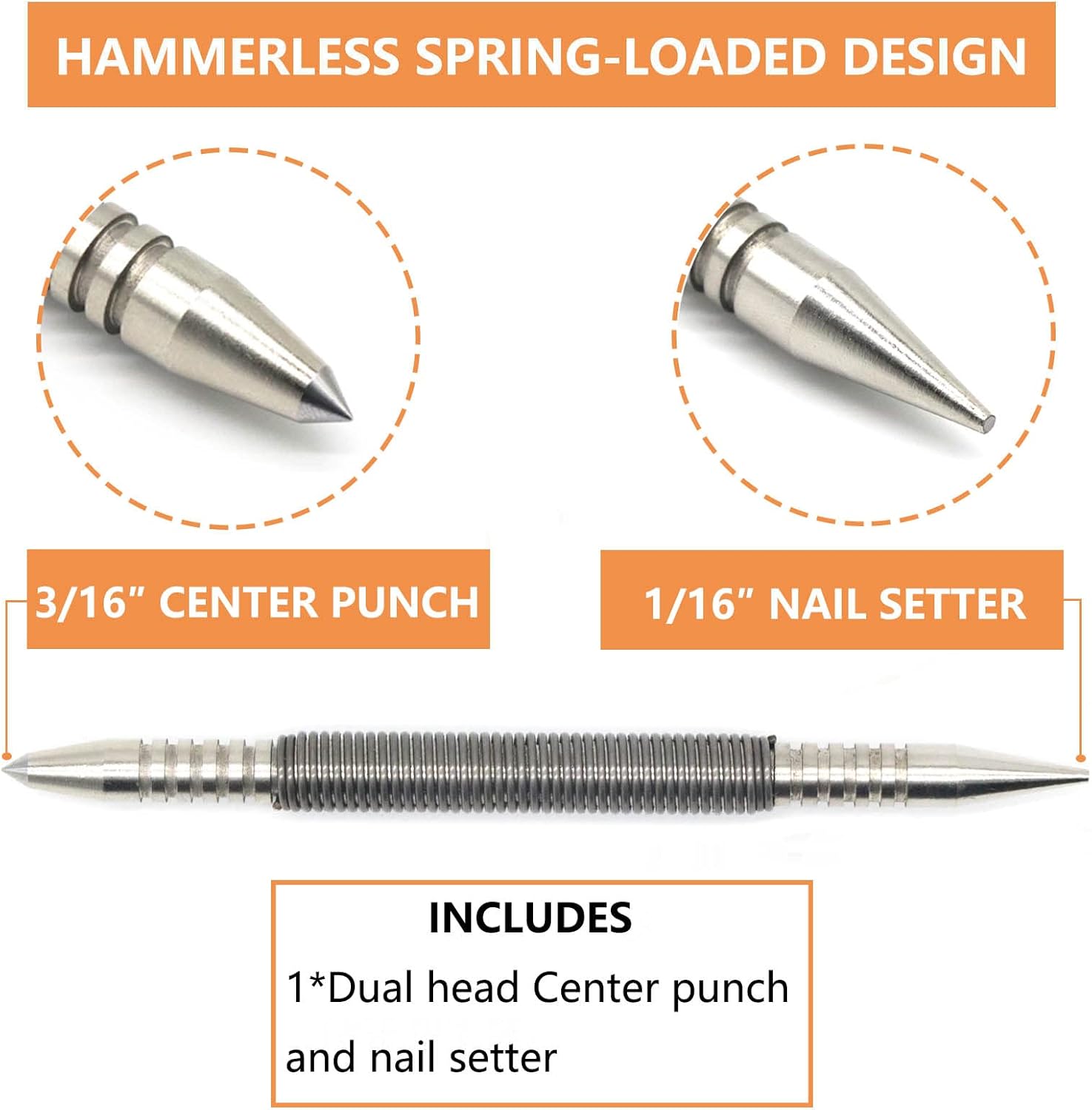 The set includes a 3/16 center punch head and a 1/16 nail setter head. The nail punch is ideal for wood applications. setting nails or making starter holes. It's perfect for creating visible marks and drilling on various surfaces.